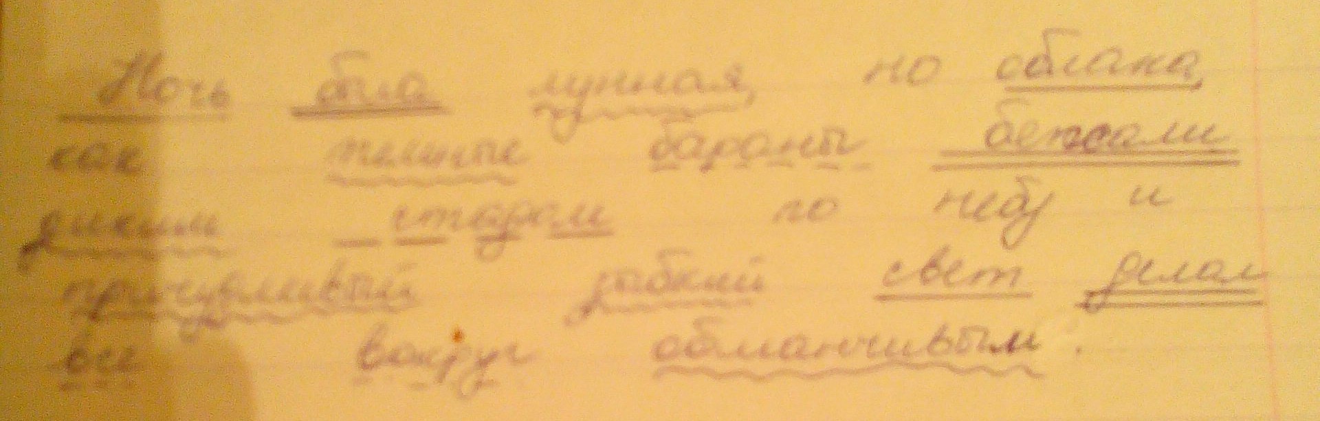 ночь была лунная но облака как темные бараны бежали диким стадом по небу и причудливый зыбкий свет делал всё вокруг обманчивым.Подчеркнуть члены предложения