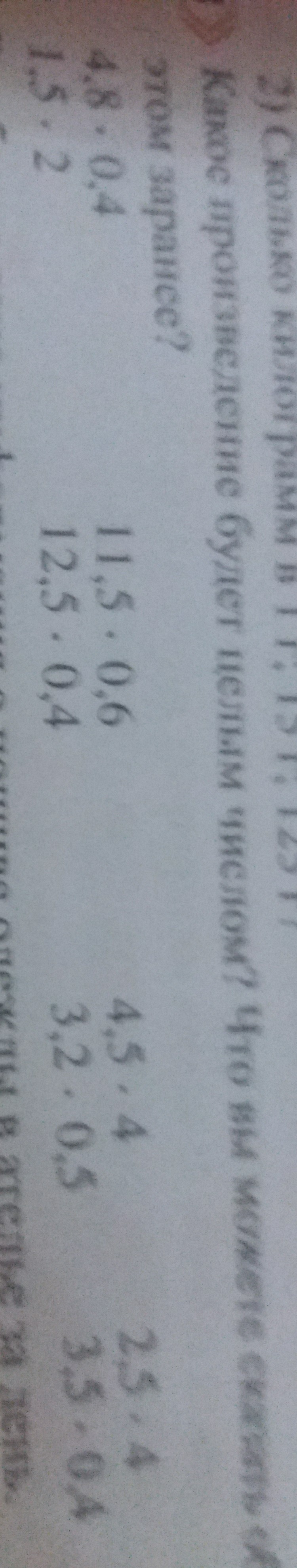 Чтобы число было целое, не должно быть знаков после запятой. Это будут нули. При умножении двух чисел с запятыми, надо чтобы получилось два ноля после запятой. Таких чисел тут нет. При умножении дробного и целого числа после запятой должен быть только один ноль. Смотрим данные числа -- все они подходят, т.к. умножая последние цифры получаем 20 или 10, а 0 отсекается запятой.