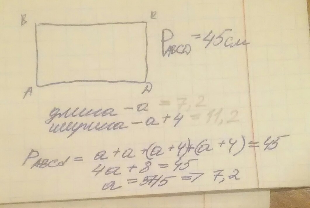 Периметр прямоугольника равен 45 см. Его длина на 4 см меньше ширины. Найти стороны прямоугольника