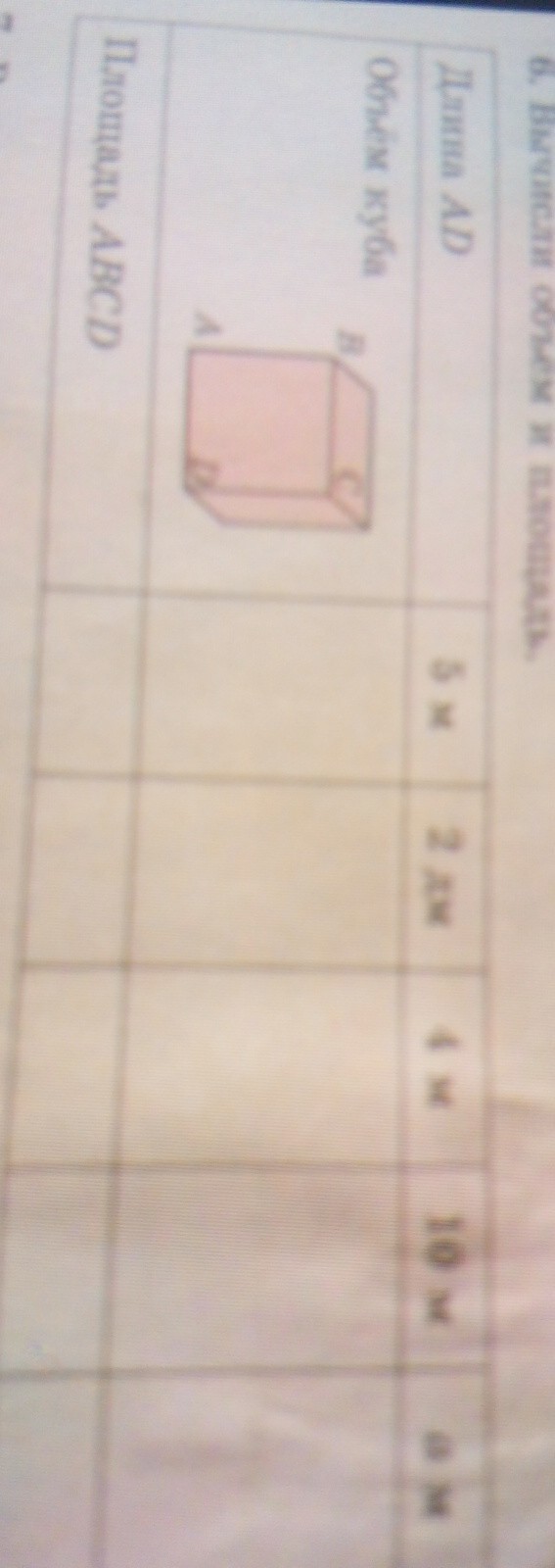 Площадь:5*5=25м^2 2*2=4дм^2 4*4=16м^2 10*10=100м^2 Объём: 5*5*5=125м^3 2*2*2=8дм^3 4*4*4=64м^3 10*10*10=1000м^3