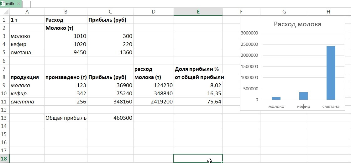 Прибыль от реализации 1 т молока, кефира и сметаны соответст¬венно равны 300, 220 и 1360 руб. Было изготовлено молока 123 т, ке¬фира 342 т, сметаны 256 т.