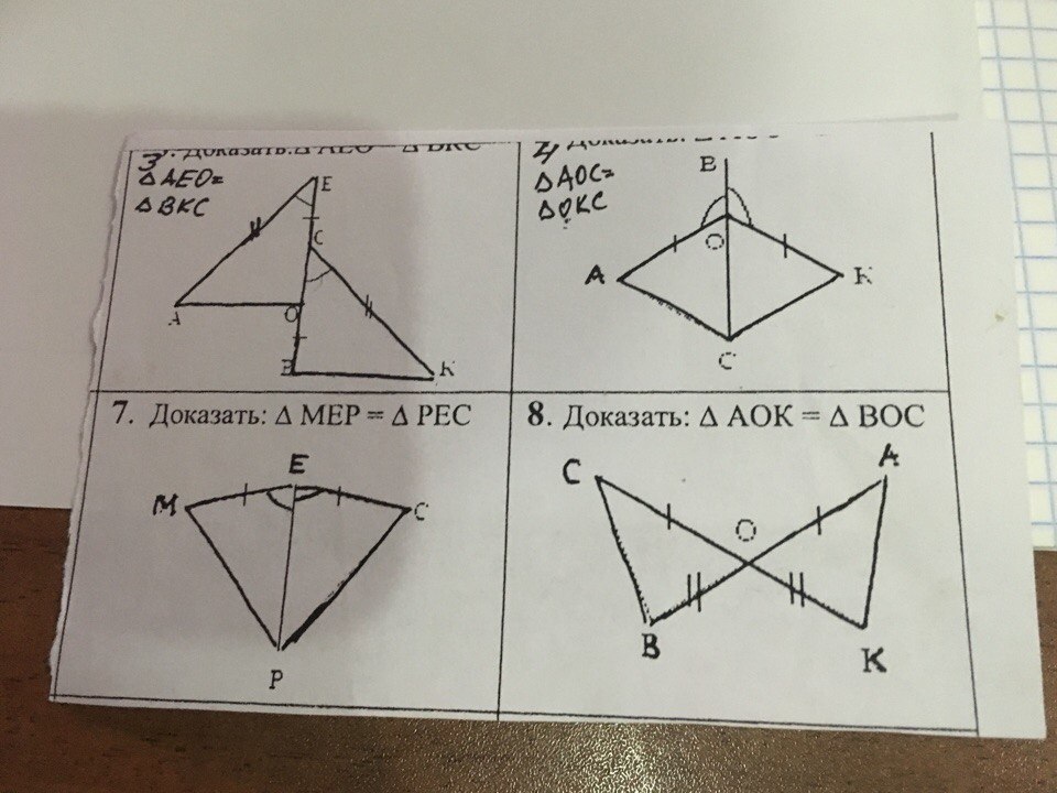 8. ОС=ОА, ВО=ОК, СОВ и АОК вертикальные углы, они равны. Значит треугольники СОВ и АОК равны по первому признаку равенства треугольников