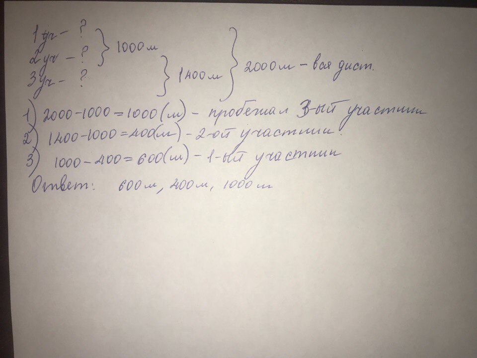 Налыжах соревновааниях школьники бежали эстафету по 3 человека на дистанции 2000м. Первый и второй участник пробежали 1000м,а второй и третий 1400 м. Сколько метроврюпробежал каждый учасник?