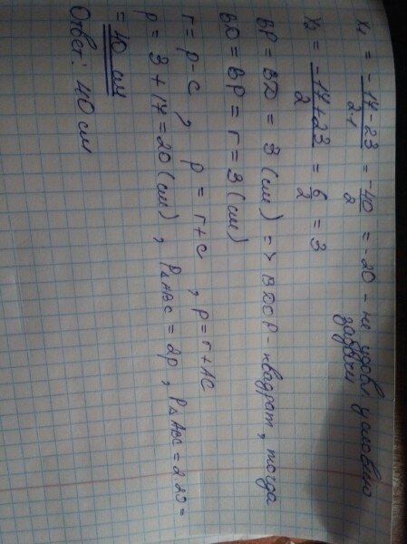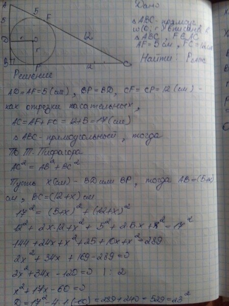 В прямоугольный треугольник вписана окружность радиуса r. Найдите периметр треугольника если точка касания делит гипотенузу на отрезки равные 5см и 12 см. Задача для 8 класса. Сделайте пж