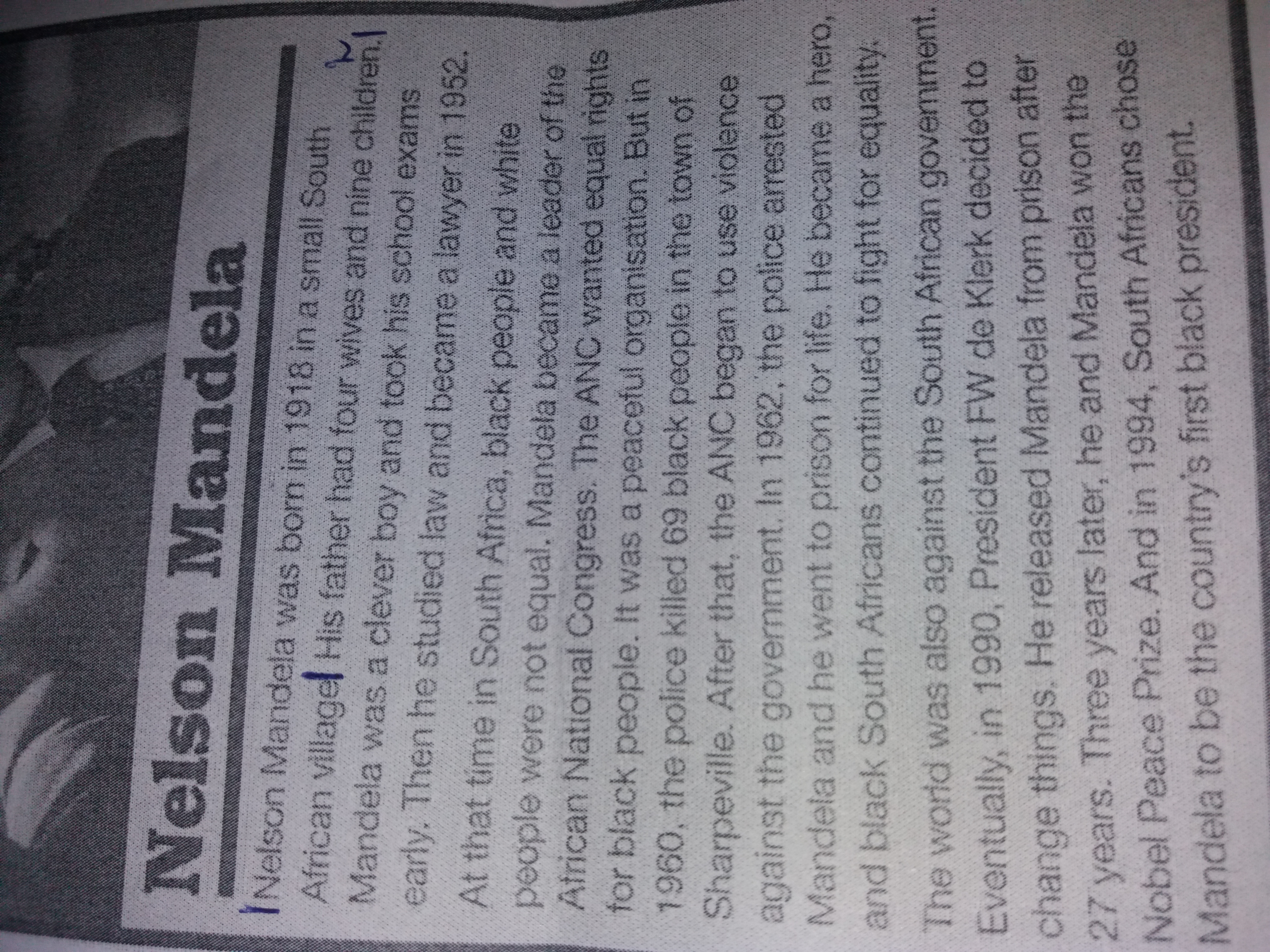 Нельсон Мандела родился в 1918 году в маленькой Южно Африканской деревушке.У его отца было 4 жены и 9 детей. Мандела был умным мальчиком и рано сдавал свои школьные экзамены.Затем он изучил право и стал юристом в 1952.В это время в Южной Африке чёрные и белые люди были неравноправны. Мандела стал лидером Африканского Национального Конгресса. АНК добивался равных прав для чёрных людей.Это была мирная организация.Но в 1960 полиция убила 69 чёрных человек в городе Шарпевиль. После этого АНК начал применять силу по отношению к правительству(против правительства).В 1962 полиция арестовала Мандела и он был приговорён к пожизненному заключению.Он стал героем и чёрные южные африканцы продолжили борьбу за равноправие.