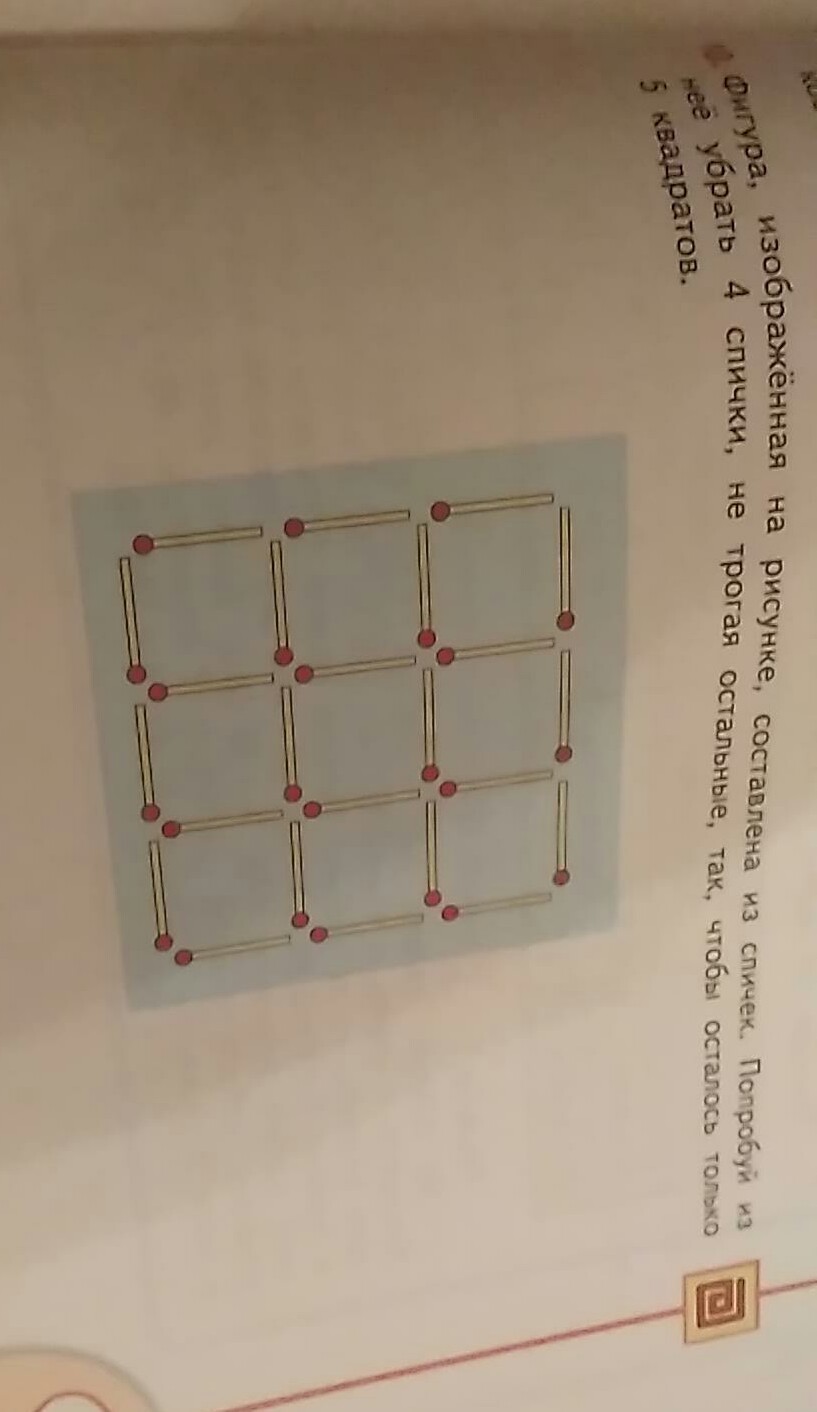 изображенный на рисунке составлена из спичек Попробуй убрать 4 спички не трогая остальные так чтобы осталось только 5 квадратов