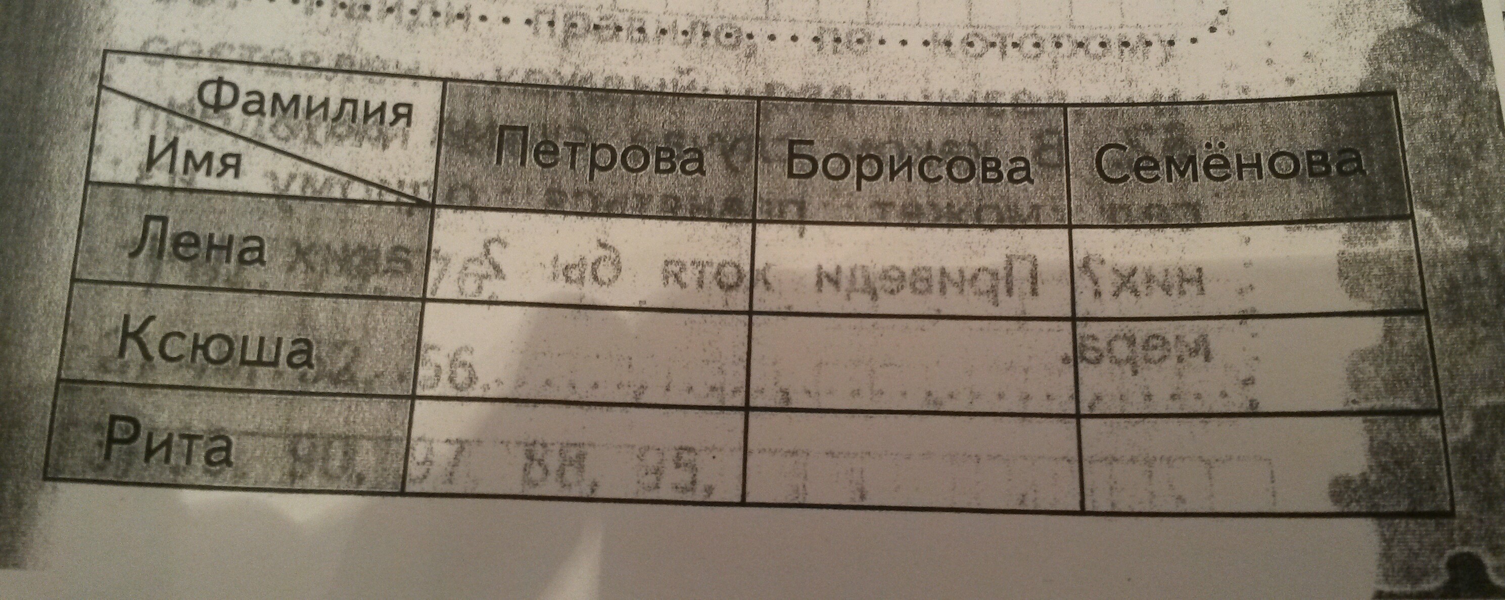 в одном доме живут Три подруги: Рита, Ксюша и Лена. Их фамилии: Петрова, Борисовна и Семёновна. У семёновны нет братьев, и она моложе Ксюша. Ксюша старше Борисовой и учится в одном классе с братом Елены. Назови фамилию каждой девочки. Для решения используя приведенную таблицу.