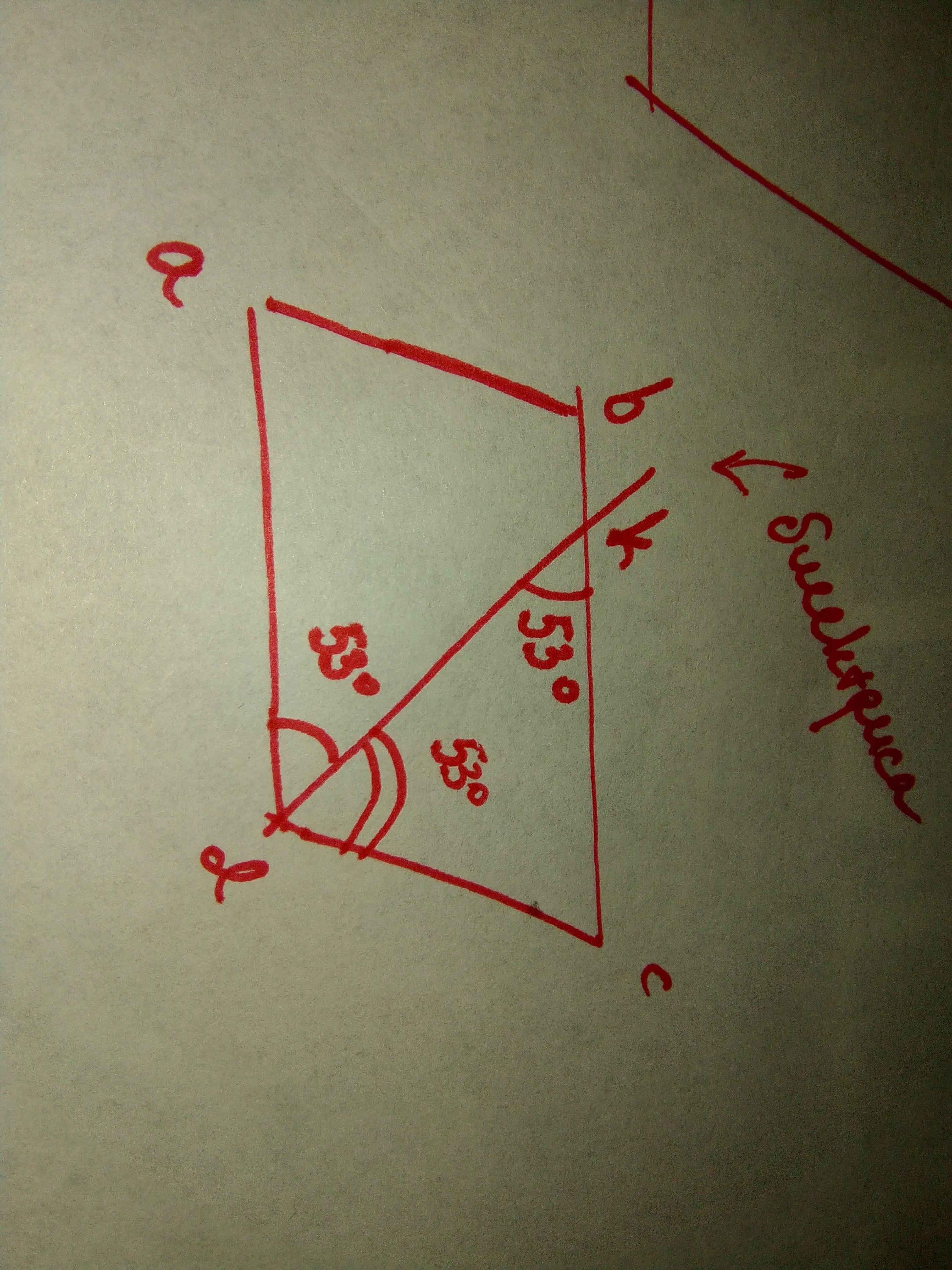 Так как DK пересекает две параллельные прямые,то два острых угла,которые она образовывает с этими прямыми будут между собой равны. В условии дано, что один из углов =53°, значит, и второй тоже.