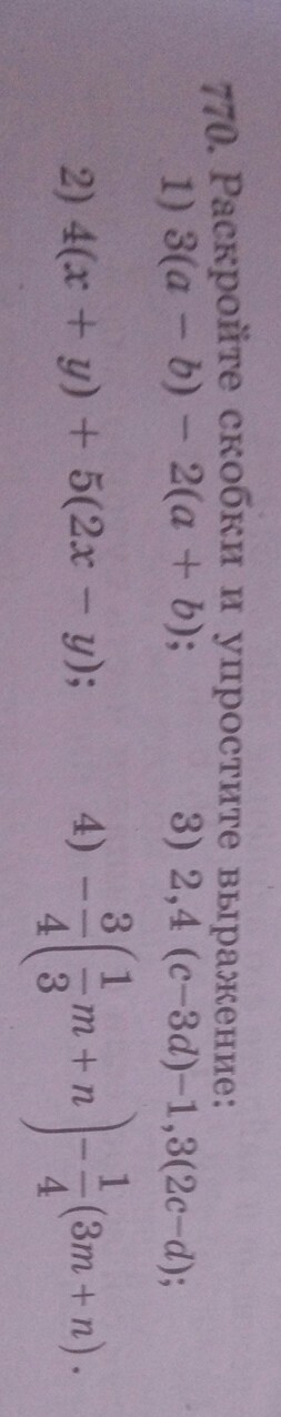 1)3(а-в)-2(а+в)=3а-3в-2а-2в=а-в 2)4(х+у)+5(2х-у)=4х+4у+10х-5у=14х-у 3)2,4(с-3d)-1,3(2c-d)=2,4c-7,2d-2,6c+1,3d=-0,2c-5,9d