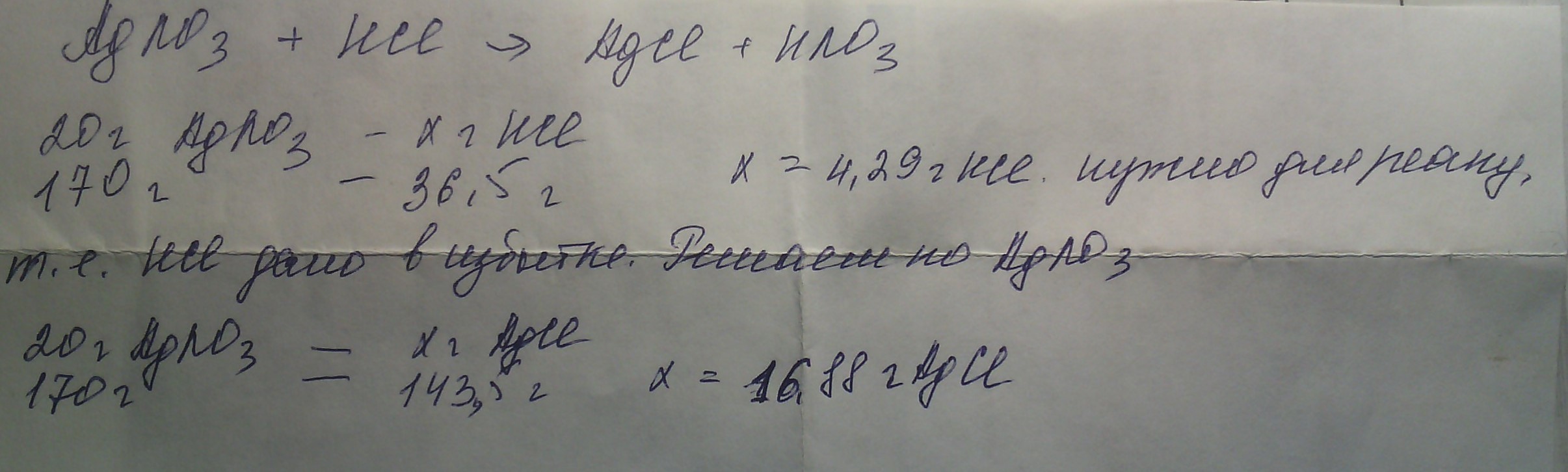 вычислить массу хлорида серебра полученного при взаимодействии 20 г нитрата серебра и 1 7 г соляной кислоты