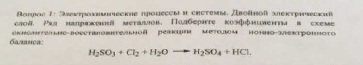 H⁺₂S⁺⁴O⁻²₃ + Cl⁰₂+ H⁺₂O⁻² = H⁺₂S⁺⁶O⁻²₄ +2H⁺Cl⁻