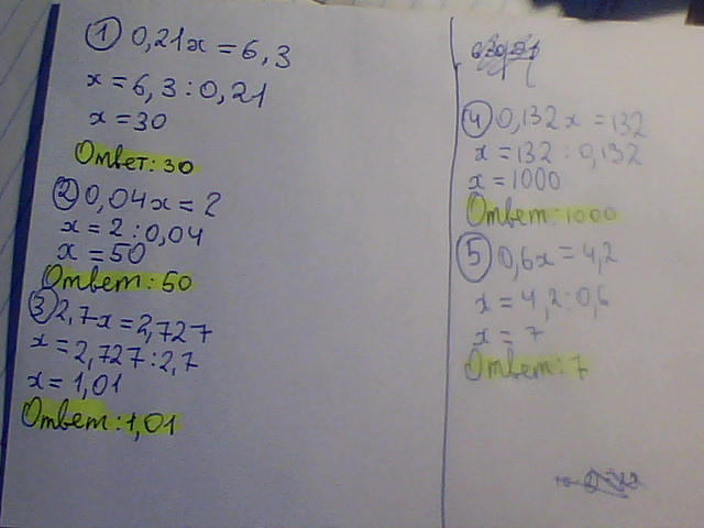 Решите уравнение:1)0,21х=6,3, 2)0,04х=2, 3)2,7х=2,727, 4)0,132х=132, 5)0,6х=4,2. помогите нужно с решением