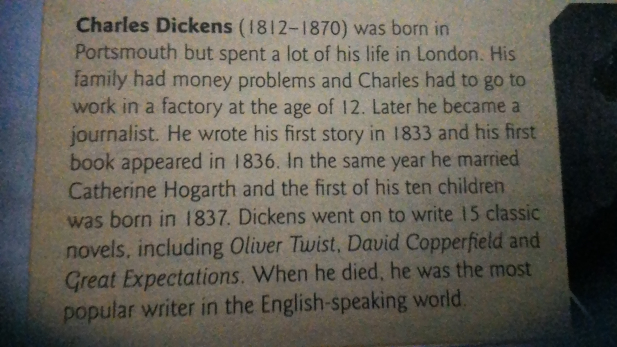 Чарльз Диккенс (1812-1870) родился в Портсмуте, но провел большую часть своей жизни в Лондоне. У его семье были проблемы с деньгами, и Чарльз вынужден был работать на фабрике в возрасте 12 лет. Позже он стал журналистом. Он написал свою первую историю в 1833 году, а его первая книга появилась в 1836 году. В том же году он женился на Кэтрин Хогарт, а первый из десяти его детей родился в 1837 году. Диккенс написал 15 классических романов, в том числе Оливера Твиста, Дэвида Копперфилда и великих ожиданий. Когда он умер, он был самым популярным писателем в англоязычном мире