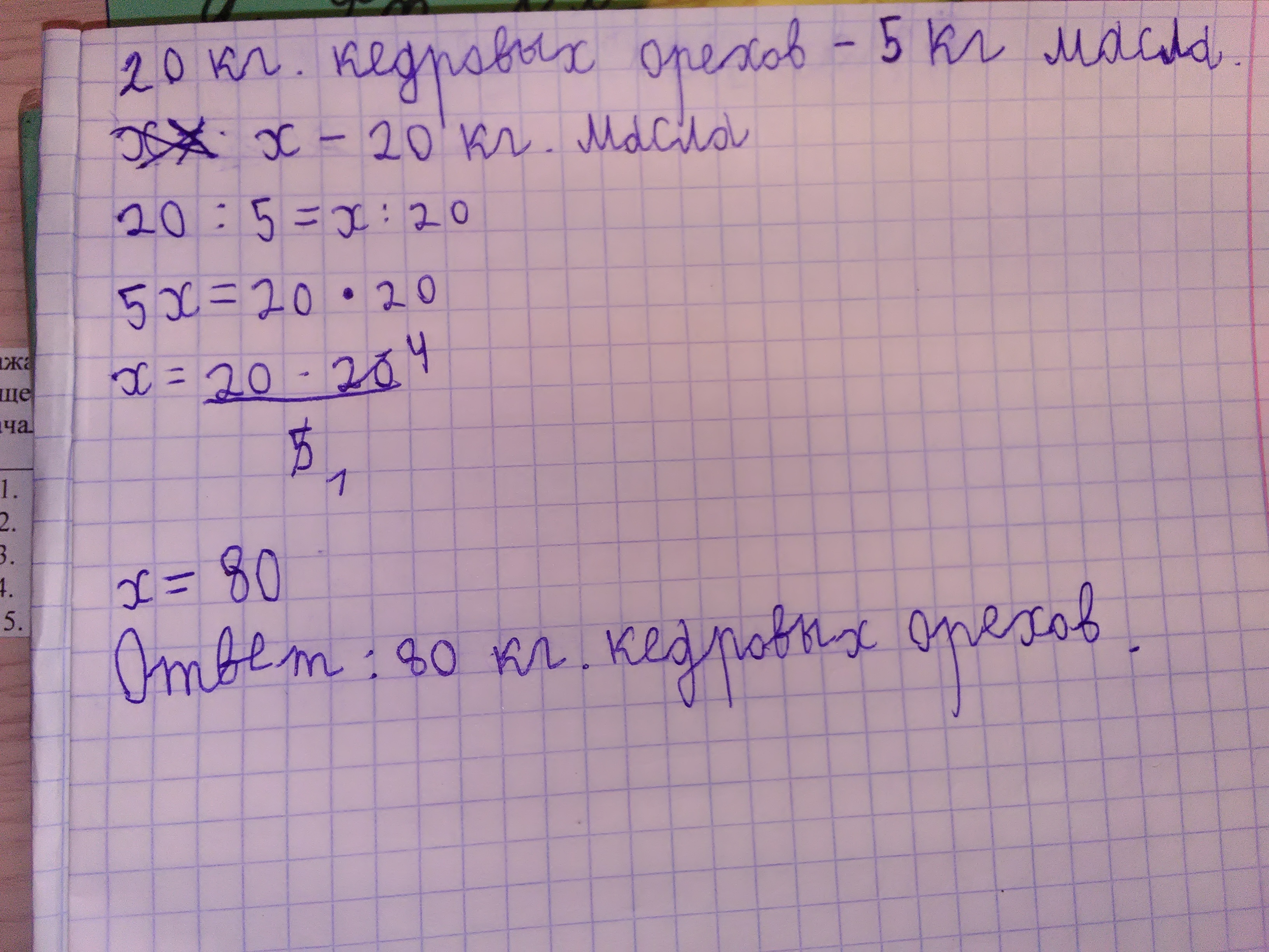 Из 20 кг кедровых орехов можно получить 5 кг масла.Сколько кедровых орехов надо взять,чтобы получить 20 кг масла?