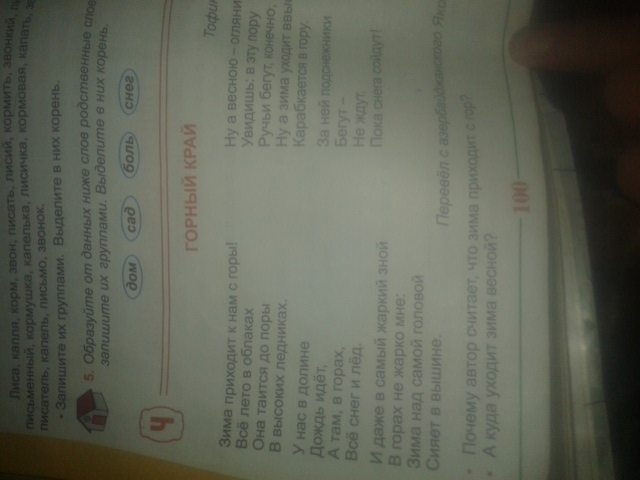 найдете в стихотворение Горный край однокоренные слова и выпишите их.выделите в них корень выполните звуко буквенный разбор слова лёд