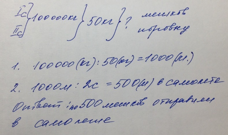 На двух самолётах отправили 100 000 кг сахарного песка по 50 кг, на обоих поровну мешков. Сколько мешков сахарного песка отправили на каждом самолёте? УСЛОВИЯ НАПИШИ МНЕ УС-ЛО-ВИ-Я!:З
