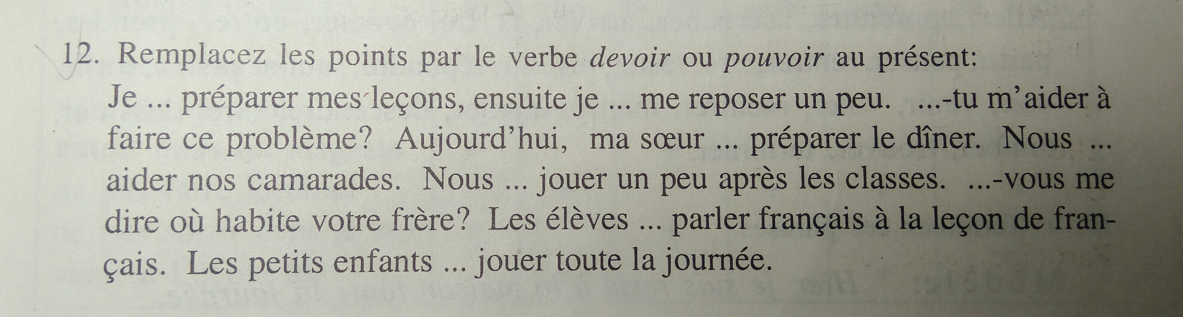 dois, peux, peux, doit, devons, pouvons, pouvez, doivent, peuvent