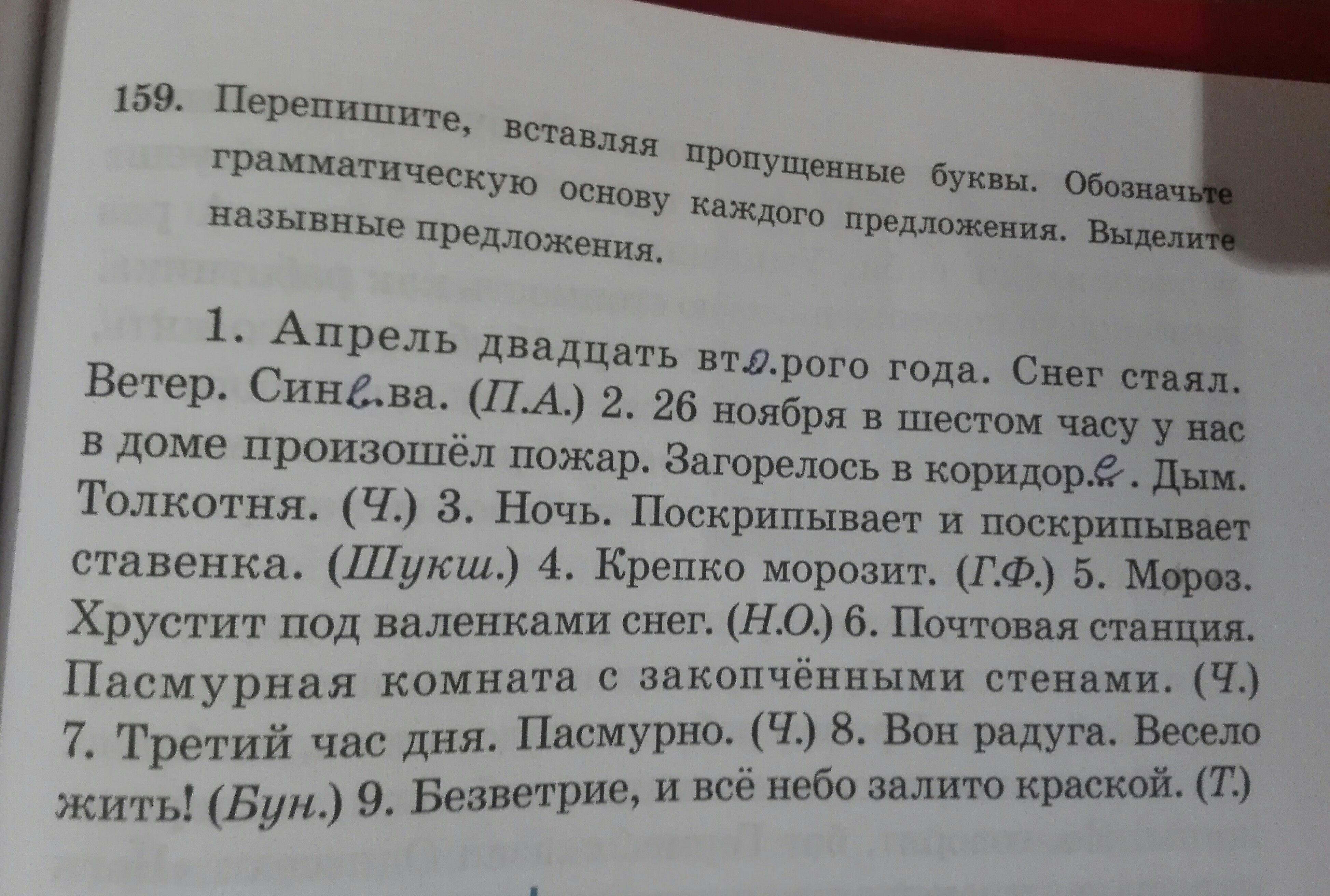 1 Апрель двадцать второго года- НАЗЫВНОЕ.Снег- таял= .Ветер- НАЗЫВНОЕ.Синева- НАЗЫВНОЕ. 2 26 ноября в шестом часу у нас в доме произошёл= пожар-.Загорелось= в коридоре.Дым- НАЗЫВНОЕ. Ночь - НАЗЫВНОЕ.Поскрипывает = и поскрипывает= ставенка-. 4 Крепко морозит= . 5 Мороз- НАЗЫВНОЕ.Весело жить =. Безветрие - НАЗЫВНОЕ, и все небо - залито = краской.