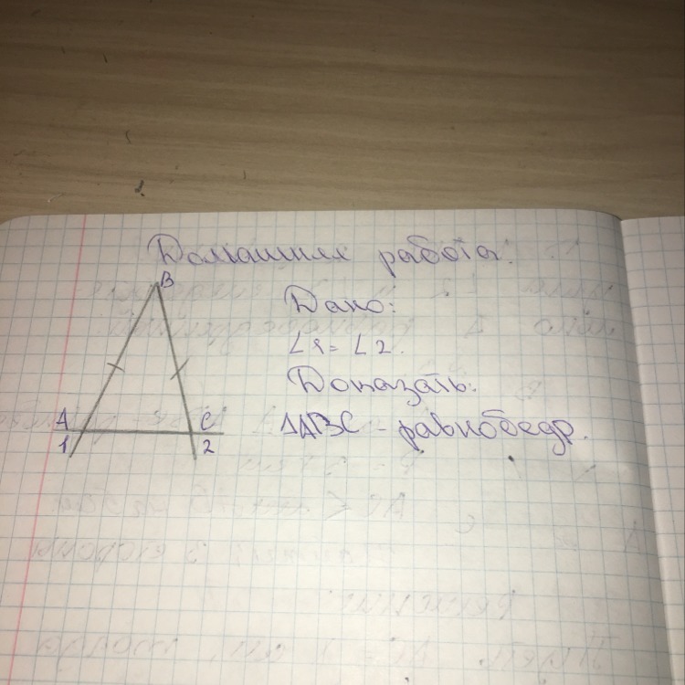 Это проще простого! Угол 1= углу 2, а угол 1 = углу ВАС (как вертик. углы), а угол 2 равен углу АСВ (как вертик. углы), а угол 1=углу2, значит угол 2 равен углу ВАС, а значит угол ВАС равен углу АСВ а это углы при основании треугольника, следовательно треугольник АВС равнобедренный.