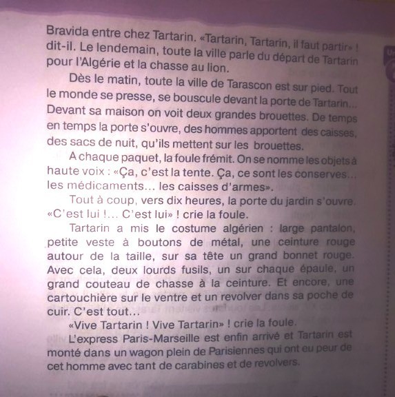 1Бравида входит в дом Тартарина. Тартарин Тартарин должен уйти, говорит он. На следующий день весь город говорит об уходе из тартан-тар-ин-лантарина, который требуется для Алжира и охоты на львов. Утром весь город Тараскон находится пешком. Все спешат, толкаются перед дверью Тартарина. Перед его домом мы видим две большие тачки. Время от времени дверь открывается, люди приносят ящики. ночные сумки, которые они надевали на тачки. В каждом пакете толпа сжимается. Объекты называются громко. Это палатка. Это консервирует наркотики ... ящики с оружием ». Внезапно, около десяти часов, открывается дверь сада. «Это он его», - кричит толпа. Тартарин положил алжирский костюм в широкие штаны, куртку с металлическими пуговицами, красный пояс вокруг талия с большой красной шапкой на голове, с двумя тяжелыми винтовками, по одному на каждом плече, большим охотничьим ножом на поясе и поясом на животе и револьвером в кожаном кармане. это все ... »Да здравствует Тартарин Да здравствует Тартарин кричит толпу. Наконец-то прибыл экспресс Париж-Марсель, и Тартарин едет в фургоне, полном париенцев, которые боялись париенцев, которые боятся этого человека с таким количеством винтовок и револьверы