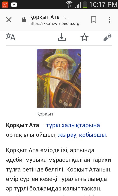 легендарный тюркский поэт-песенник и композитор IX века, выходец из степей вдоль реки Сырдарья . Создатель кобыза, акын, сказитель,покровитель поэтов и музыкантов. Предания о Коркыте встречаются у тюркских народов кипчакской (казахи,каракалпаки) и особенно южной огузской ветви: туркмен, азербайжансов и турок. У них всех практически общий народный эпос.