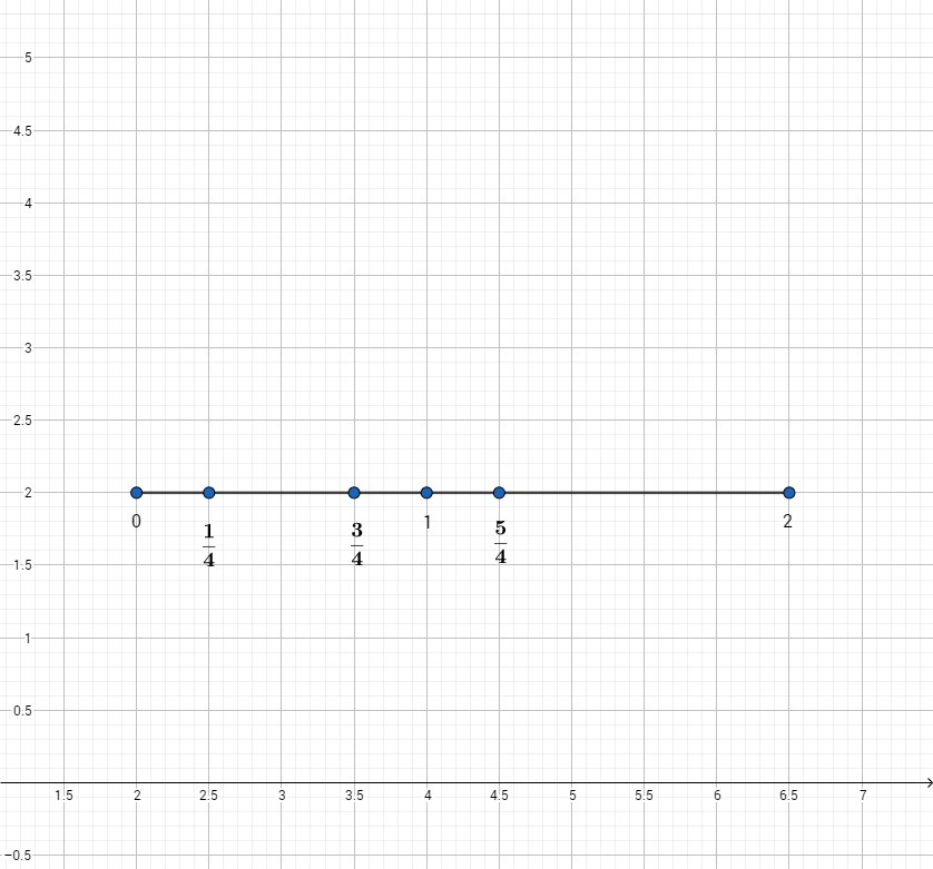 Постройте числовую ось. Разделите единичный отрезок на 4 равные части. Отметьте на числовой оси точки, соответствующие дробям: 1/4, 3/4, 5/4.