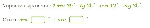Упрости выражение: 2sin29°⋅tg25°⋅cos12°⋅ctg25°