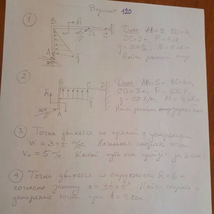 скорость-это первая производная по времени от перемещения, т.е. V=s'(t)=3+3tt, при t=4 c V=3+3*16=3+48=51 м/с. Точка движется по окружности, значит ее полное ускорение состоит из касательной и нормальной составляющей. Касательное ускорение=первая производная от скорости=v'(t)=3t=3*4=12 м/сс. Нормальное ускорение = vv/R=12*12/6=24 м/cc. Полное ускорение= корень((an)^2+(at)^2)=корень(144+576)=26,83 м/cc.