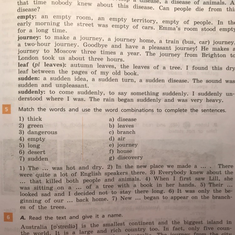 1) desert air, 2) sudden discovery, 3) dangerous disease, 4) thick branch, 5) empty house, 6) long journey, 7) green leaves