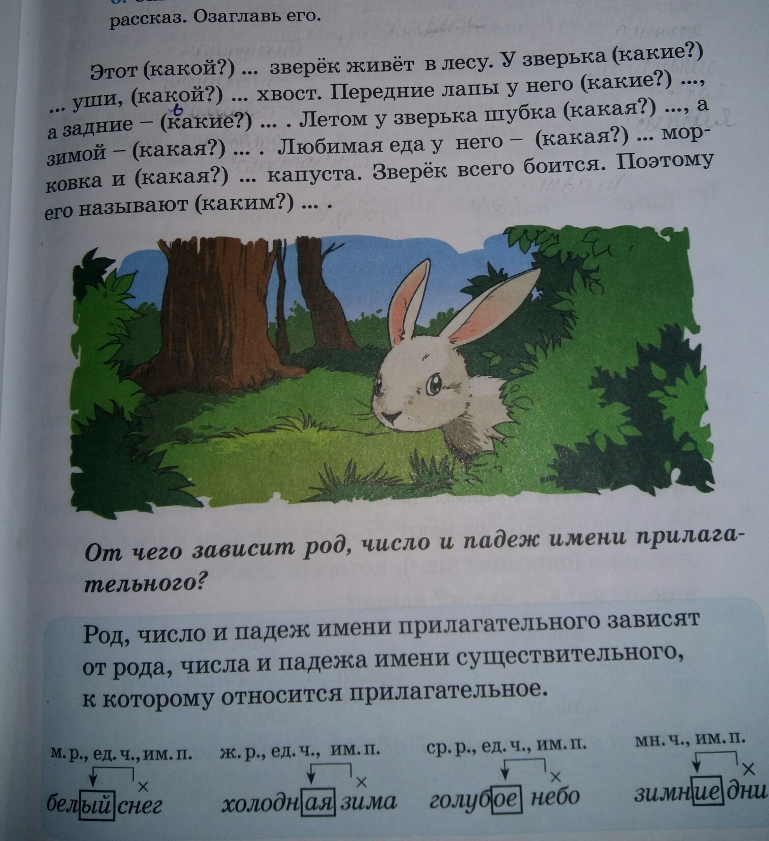 Этот милый зверёк живёт в лесу. У зверька длинные уши, пушистый хвост. Передние лапы у него короткие, а задние- длинные. Летом у зверька шубка летом тёмная,а зимой-белоснежная. Любимая еда у него-свежая морковка и белокочанная капуста. Зверёк всего боится. Поэтому его называют трусливым.