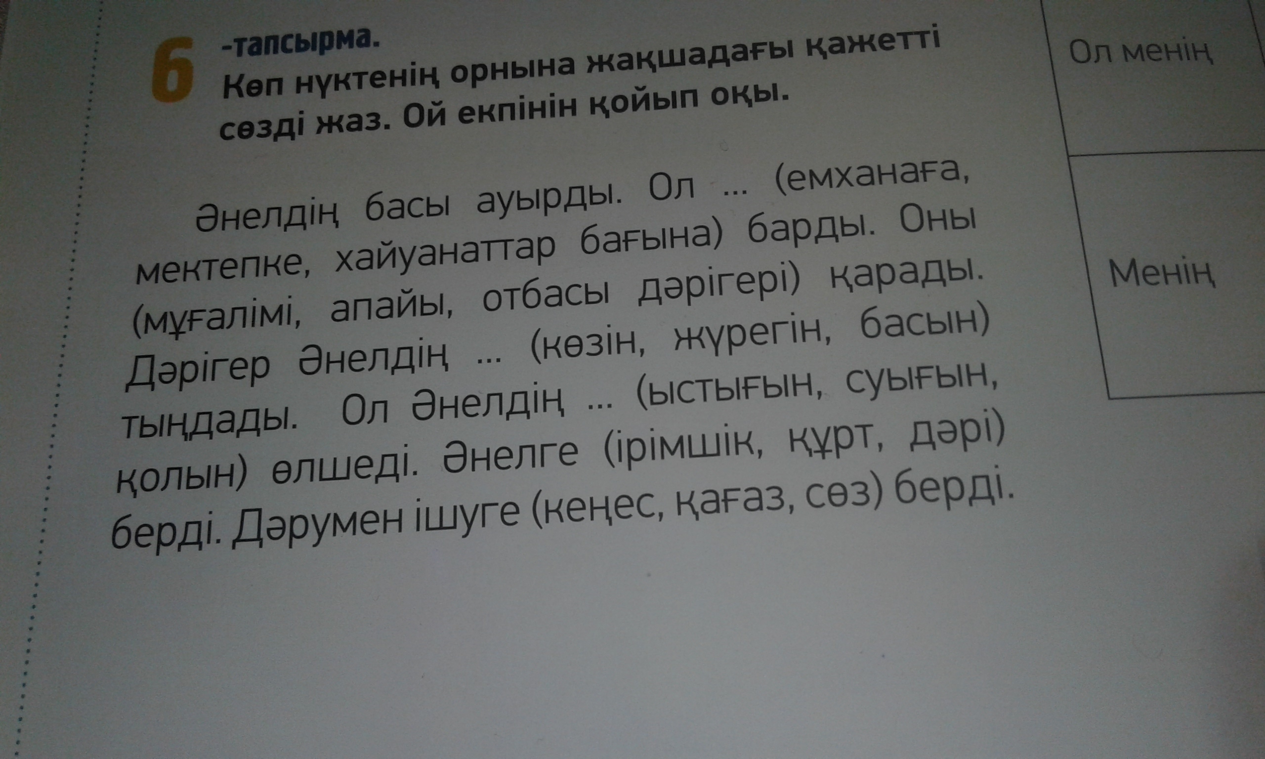 Әнелдің басы ауырды.Ол емханаға барды.Оны дәрігер қарады.Дәрігер Әнелдің жүрегін тыңдады.Ол Әнелдің ыстығын өлшеді.Әнелге дәрі берді.Дәуірмен ішуге кеңес берді.