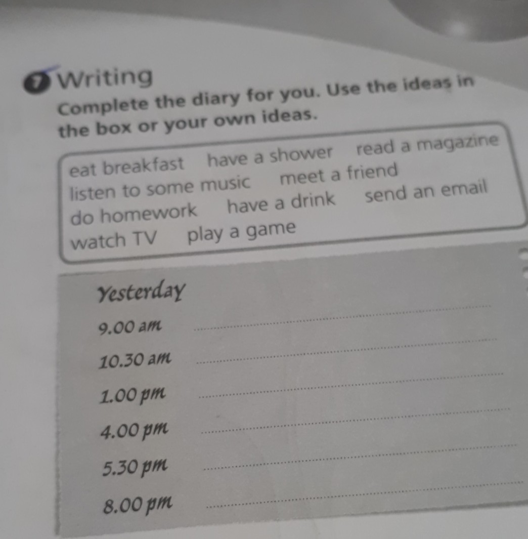 в 9:00 иду кушать в 10:30 моюсь час читаю в 4:00 Делаю домашнее задание,слушаю музыку и играю в игры в 5:30 listen to some music и meet a friend. 8:00 send an email and A Drink
