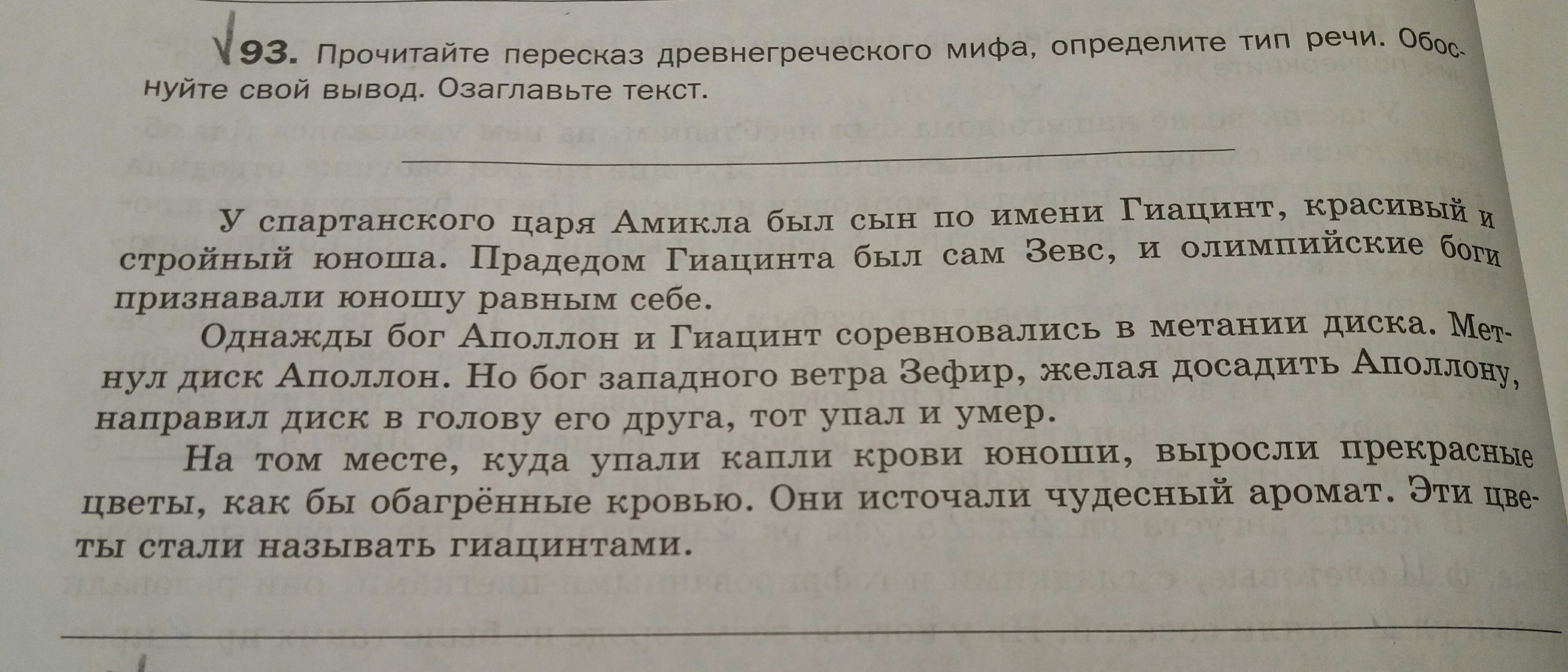 проситайте пересказ древнегреческого мифа, определите тип речи. Обоснуйте свой вывод. Озаглавьте текст