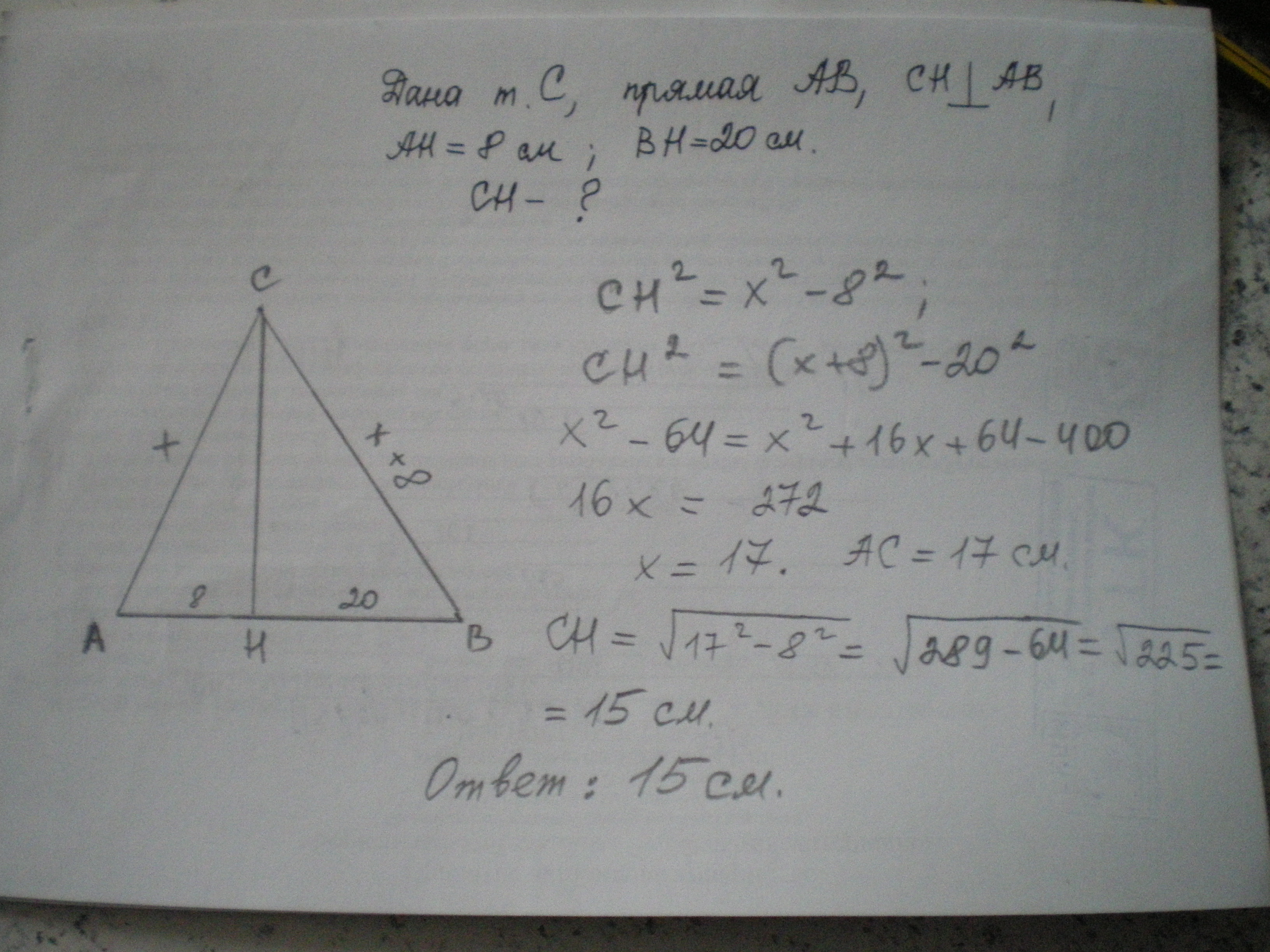 Из точки к прямой провели перпендикуляр и две наклонные, разность длин которых составляет 8 см. Найдите длину перпендикуляра, если проекции наклонных равны 8 см и 20 см.