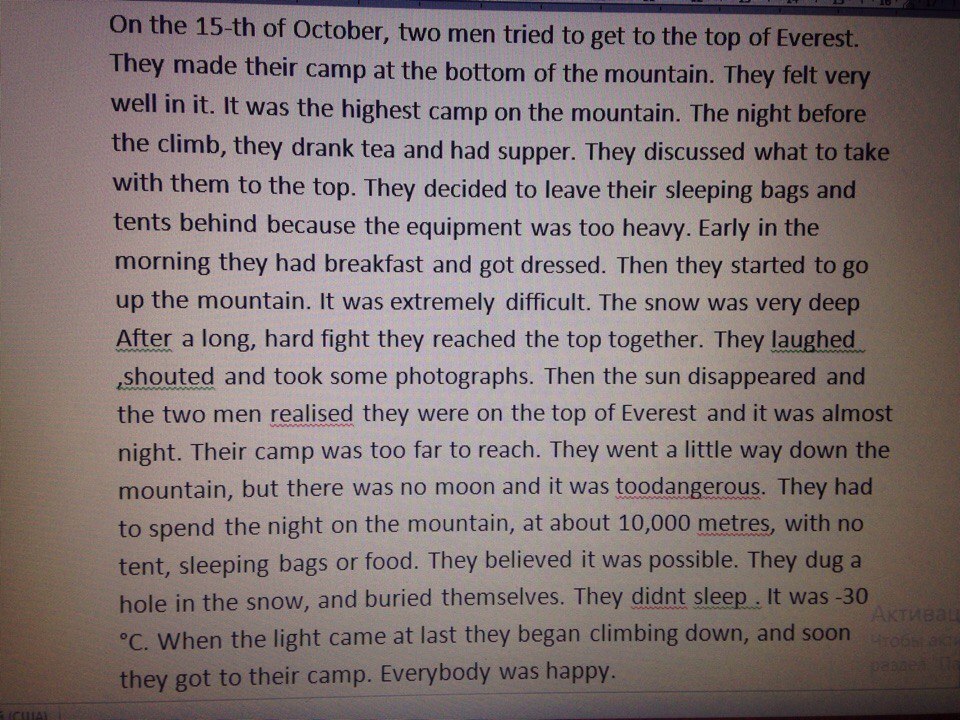 On the 15-th of October, two men (to try) to get to the top of Everest. They (to make) their camp at the bottom of the mountain. They (to feel) very well in it. It (to be) the highest camp on the mountain. The night before the climb, they (to drink) tea and had supper. They (to discuss) what to take with them to the top. They (to decide) to leave their sleeping bags and tents behind because the equipment (to be) too heavy. Early in the morning they (to have) breakfast and (to get) dressed. Then they (to start) to go up the mountain. It (to be) extremely difficult. The snow (to be) very deep After a long, hard fight they (to reach) the top together. They (to laugh), (to shout) and (to take) some photographs. Then the sun (to disappear) and the two men (to realise) they (to be) on the top of Everest and it (to be) almost night. Their camp (to be) too far to reach. They (to go) a little way down the mountain, but there (to be) no moon and it (to be) too dangerous. They (to have) to spend the night on the mountain, at about 10,000 metres, with no tent, sleeping bags or food. They (to believe) it (to be) possible. They (to dig) a hole in the snow, and (to bury) themselves. They (not to sleep). It (to be) -30 °C. When the light (to come) at last they (to begin) climbing down, and soon they (to get) to their camp. Everybody (to be) happy.