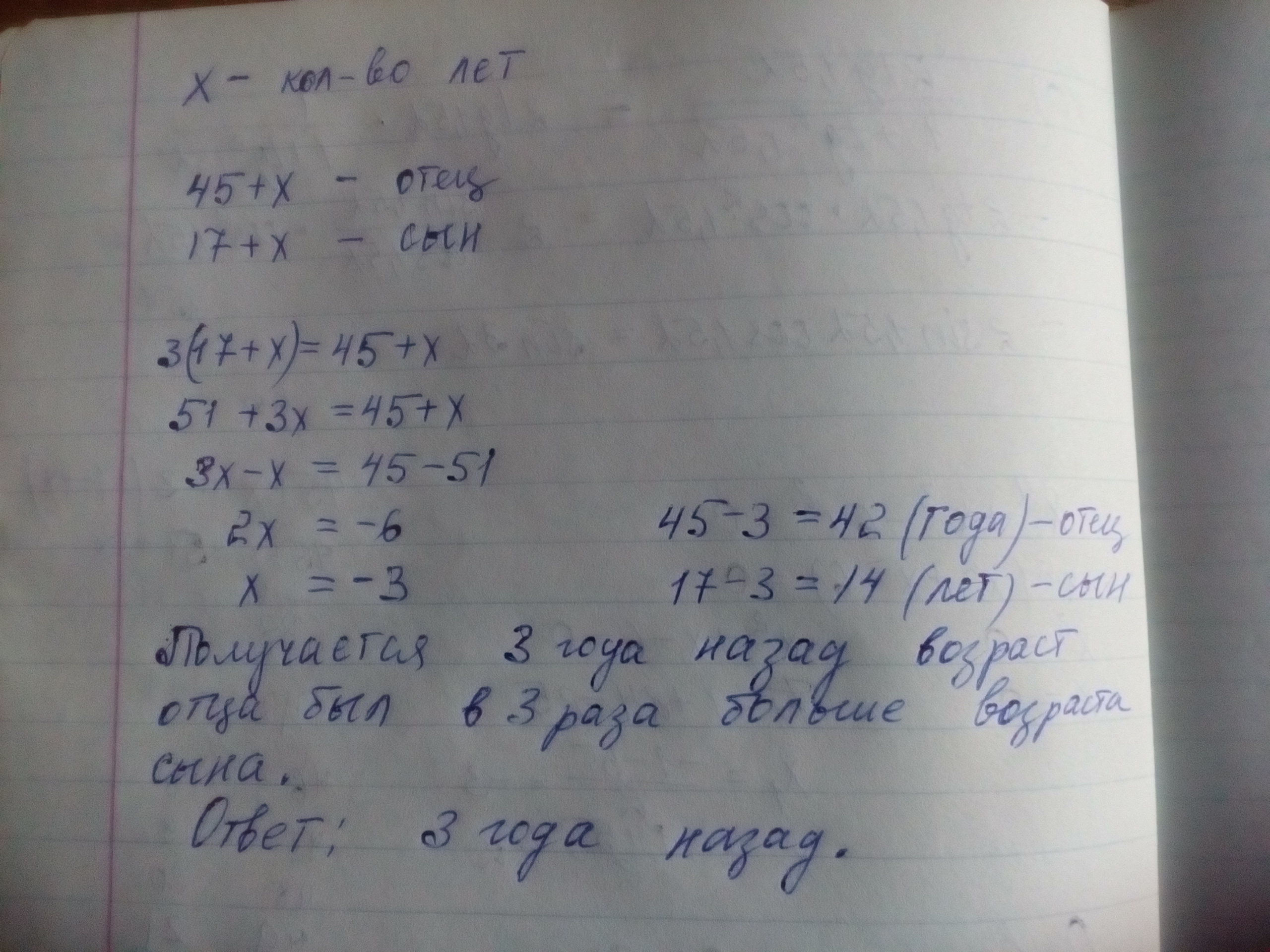 отцу 45,а сыну 17 лет.Через сколько лет возраст отца будет в 3 раща больше возраста сына?Пожалуйста решите с уравнением