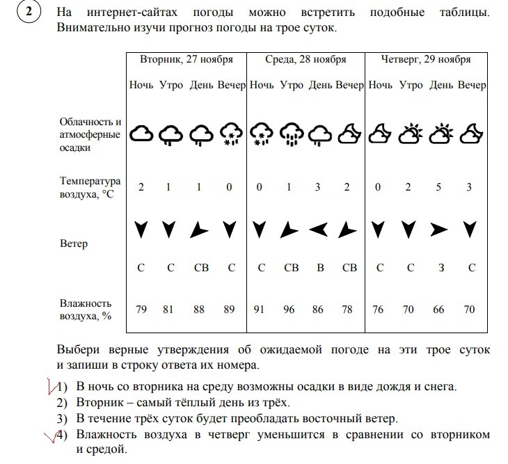 На интернет-сайтах погоды можно встретить подобные таблицы. Внимательно изучи прогноз погоды на трое суток. Вторник, 27 ноября Среда, 28 ноября Четверг, 29 ноября Ночь Утро День Вечер Ночь Утро День Вечер Ночь Утро День Вечер Облачность и атмосферные осадки Температура воздуха, °C 2 1 1 0 0 1 3 2 0 2 5 3 Ветер С С СВ С С СВ В СВ С С З С Влажность воздуха, % 79 81 88 89 91 96 86 78 76 70 66 70 Выбери верные утверждения об ожидаемой погоде на эти трое суток и запиши в строку ответа их номера. 1) В ночь со вторника на среду возможны осадки в виде дождя и снега. 2) Вторник – самый тёплый день из трёх. 3) В течение трёх суток будет преобладать восточный ветер. 4) Влажность воздуха в четверг уменьшится в сравнении со вторником и средой. Ответ: _________________