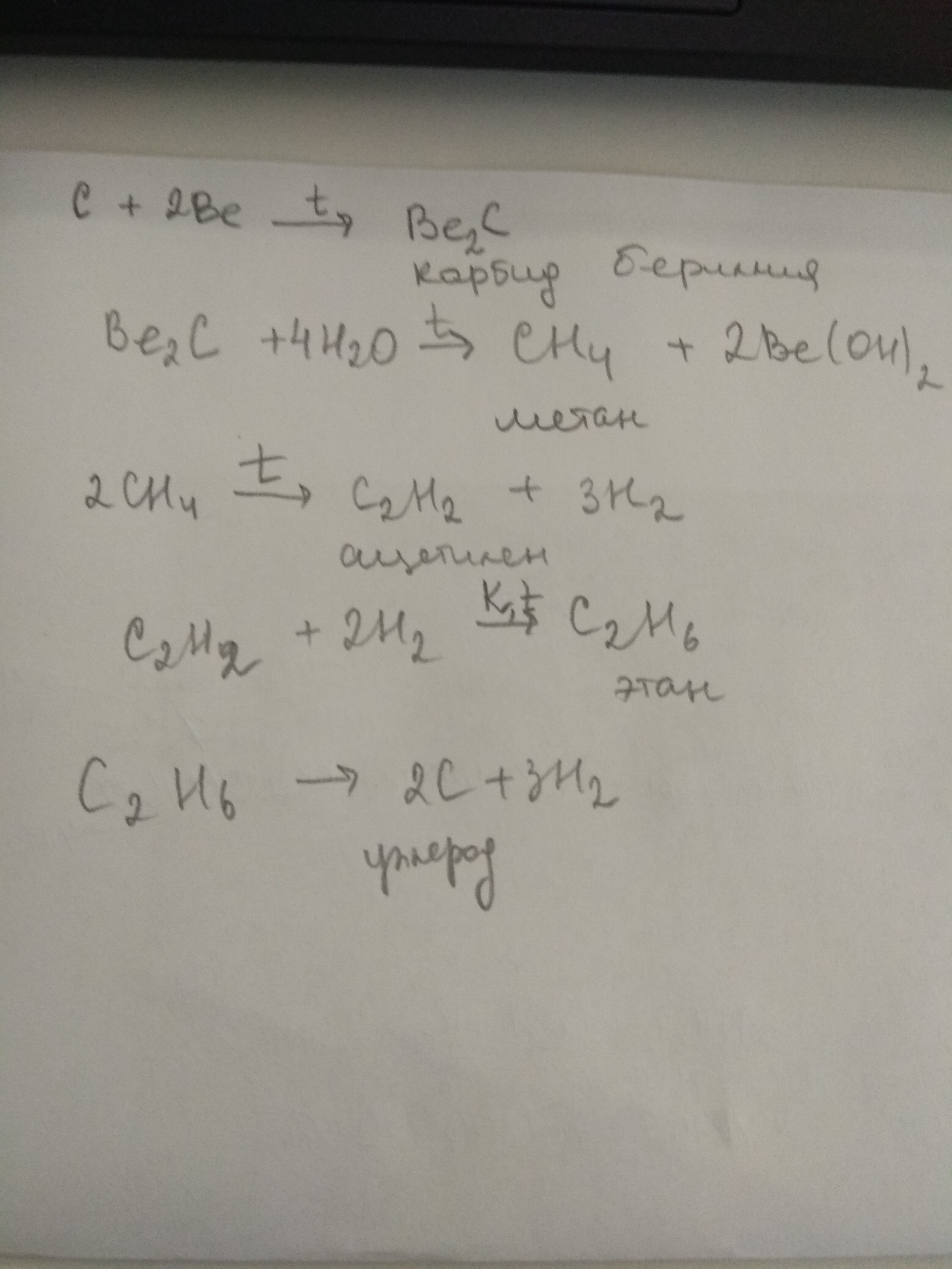 Распишите цепочку превращений, пожалуйста, срочно!!! Углерод (сажа)-карбид бериллия-метан-ацетилен-этан-углерод (сажа)