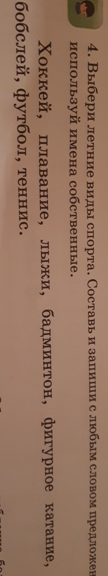 Выбери летние виды спорта. составь и запиши с любым словом предложения используй имена собственные