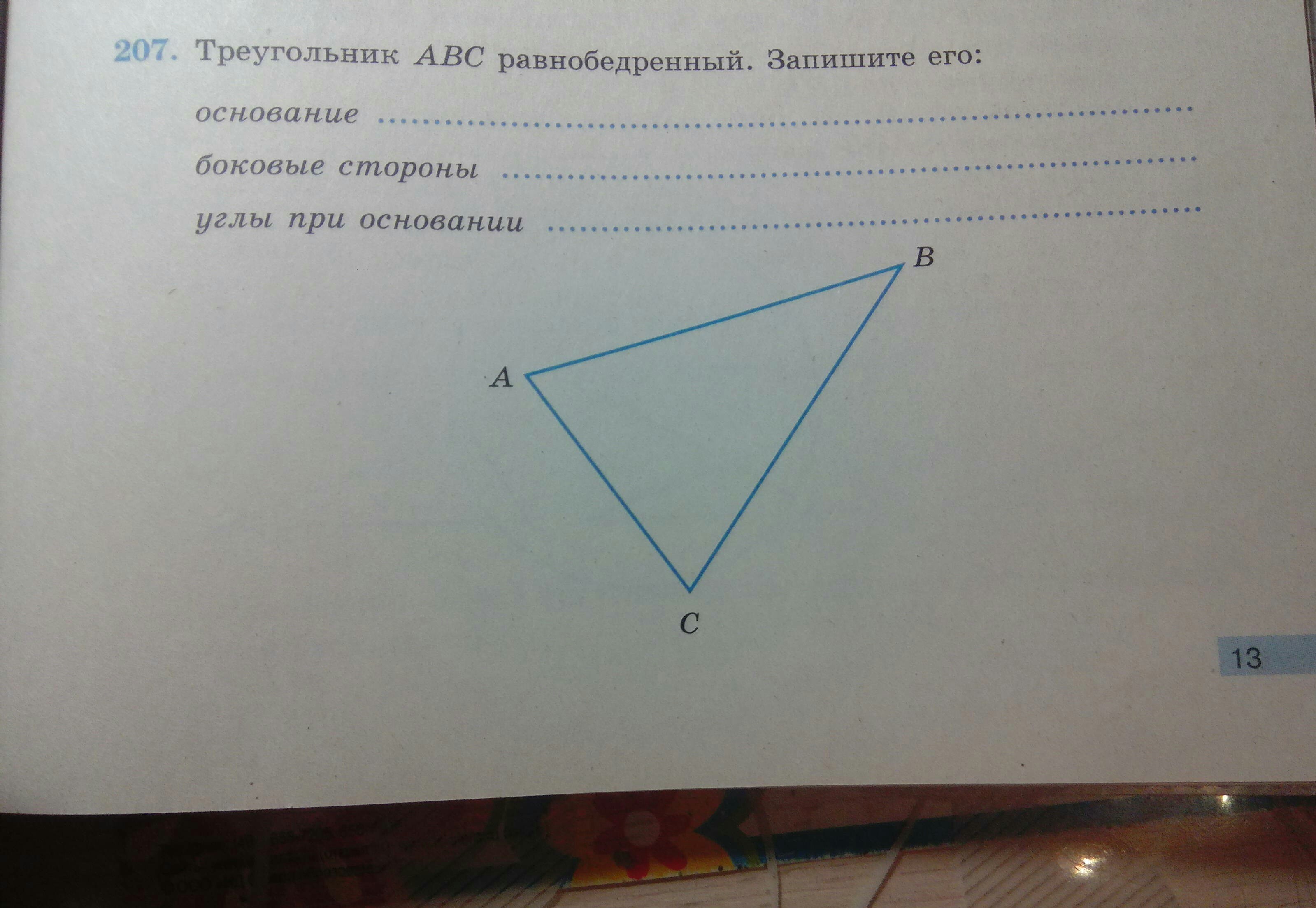 Треугольник ABC равнобедренный. Запишите его: основание,боковые стороны, углы при основании.