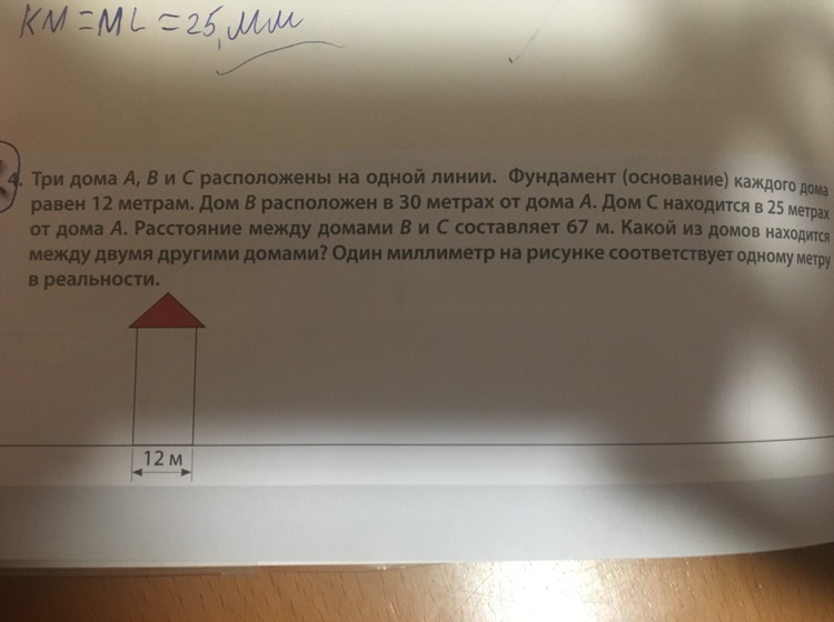 Начерти рядом по линейке заданные расстояния, отмерь по 12м фундамент каждого здания и все. Здесь главное начертить и все станет понятно