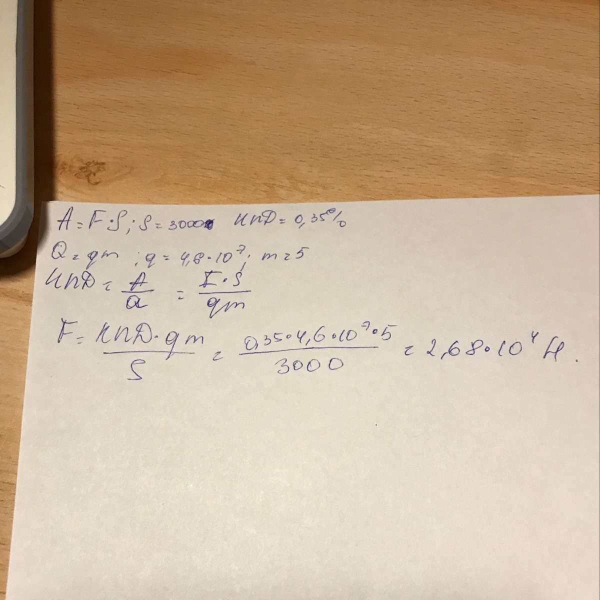 Трактор во время вспашки потребляет 5 кг. солярки и на 3 км. пашни . Какова сила тяги его мотора ,если его КПД равен 35% ? Удельная теплота сгорания солярки равна q=4,6*10^7 ДЖ/Кг