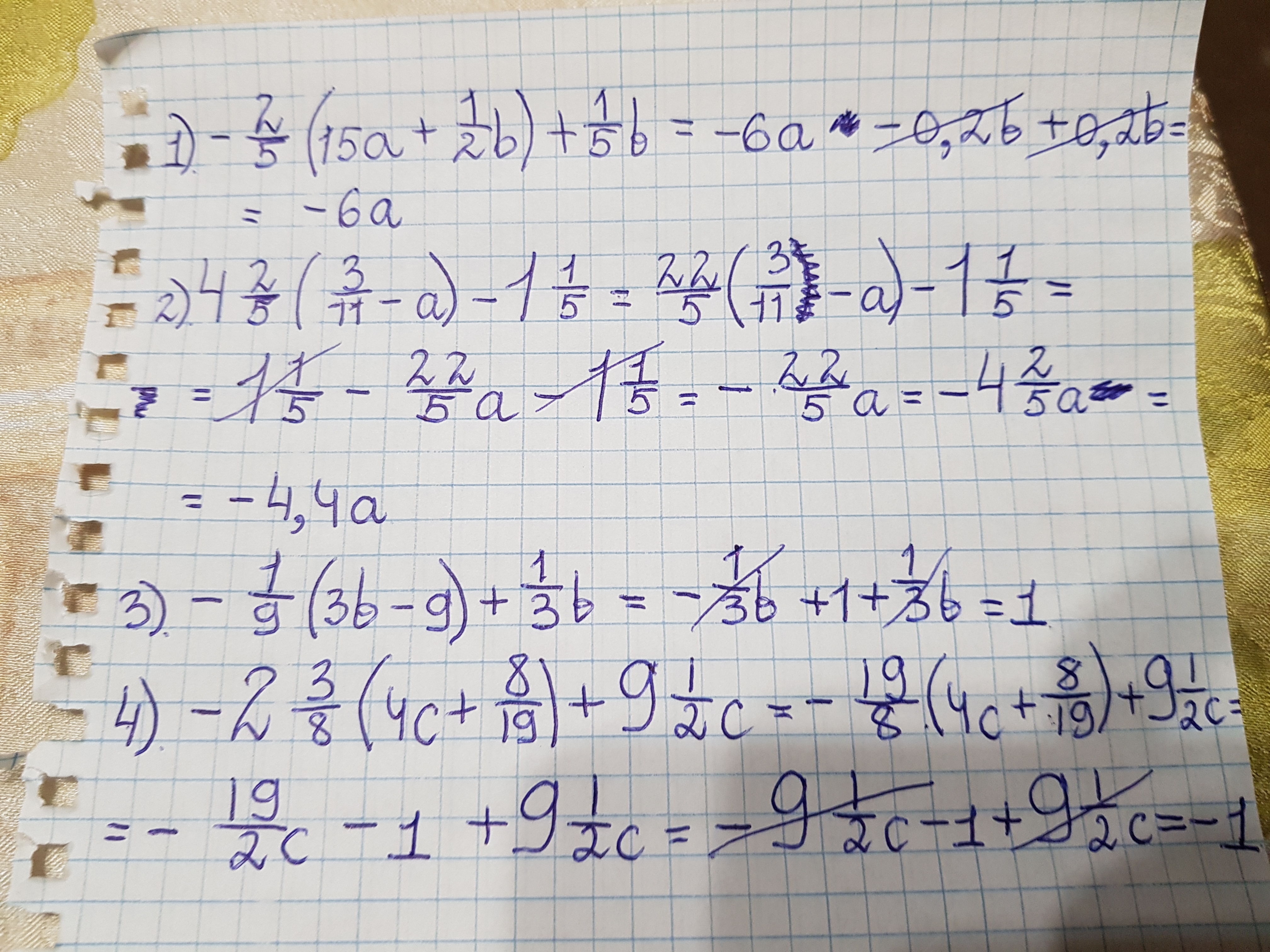 упростить выражение -2/5(15a+1/2b)+1/5b; 4 2/5(3/11-a)-1 1/5; -1/9(3b-9)+1/3b; -2 3/8(4c+8/19)+9 1/2c.