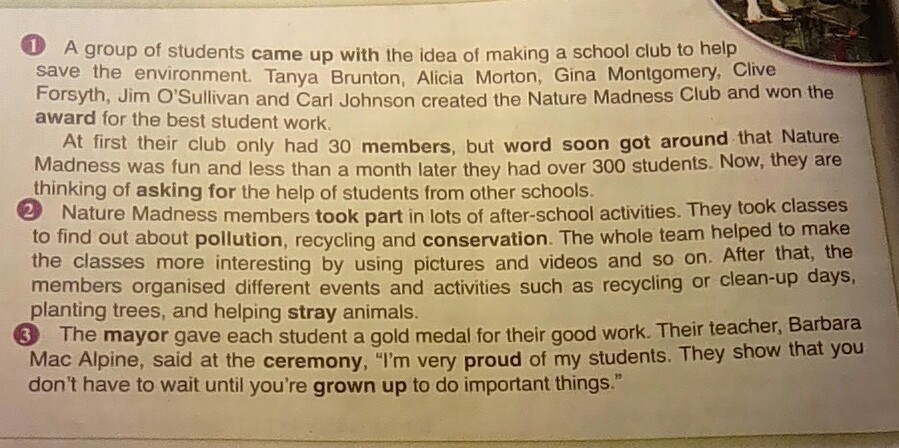 Э груп ой студентс кейм см виз за айдиа оф мейкинг э скул клаб ту хэлп сейв за инвайронмент. Таня Брунтон , Алис Мортон, Гина Монтгомери , Клиф Форси , Джим О`Саливан анд Карл Джонсон креэйтед зе начур мэднесс клаб анд вон зе авард фор зе бест студент ворк.