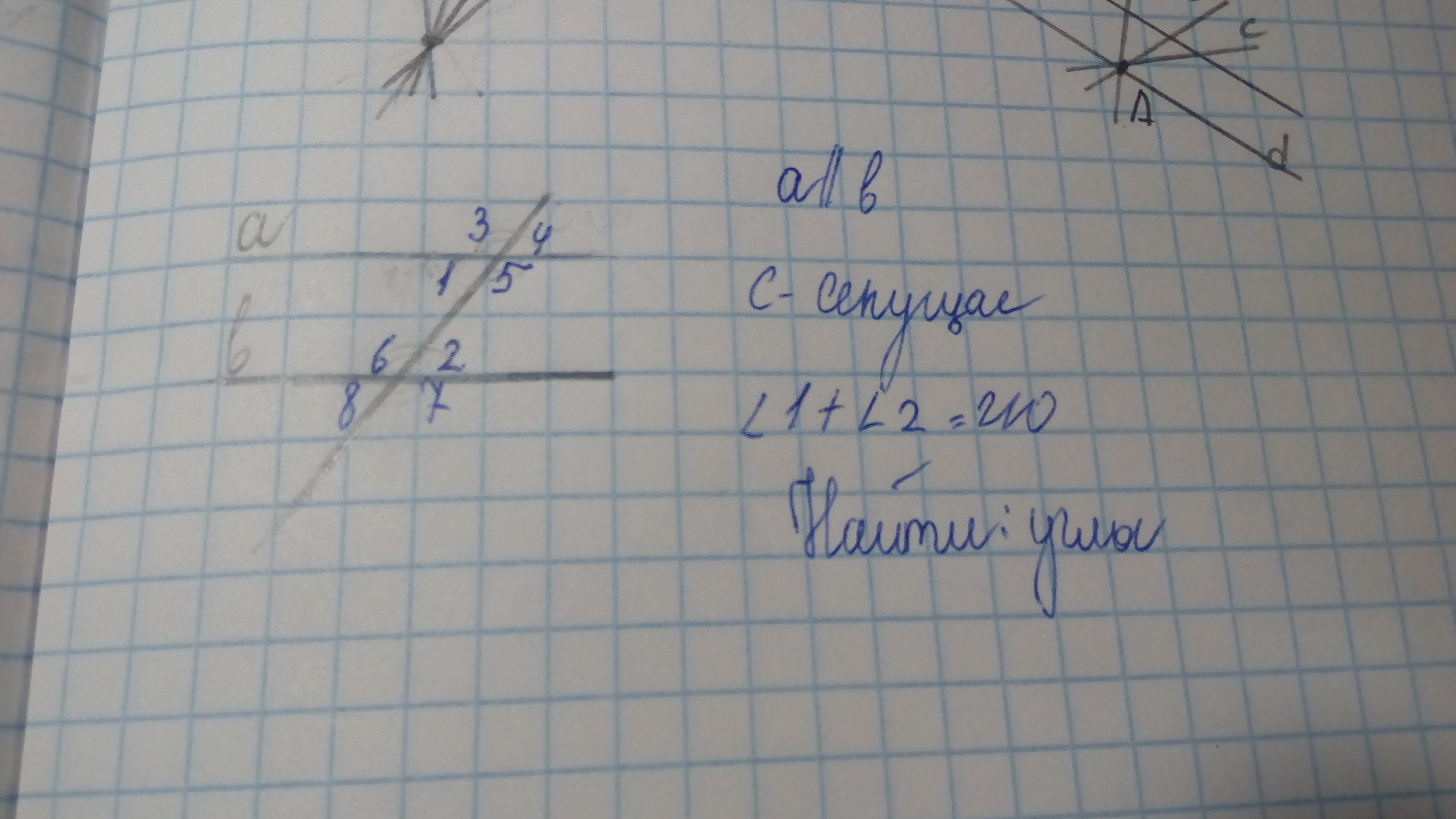 угол 1 = 2 так как накрест лежащие углы, следовательно, 210:2=105(угол 1) и угол 2 тоже 105 градусов. угол 1 равен углу 4 (вертик. углы); угол 4 равен углу 2 ( как соответств. углы) следовательно угол 4 равен 105 градусов; угол 2 равен углу 8(вертик. углы) угол 8 = 105 градусов; угол 1 и угол 6 односторонние (в сумме дают 180 градусов) следовательно, угол 6= 180-105=75 градусов; угол 6 равен углу 5 (накрест лежащие углы) угол 5 =75 градусов; угол 5 равен углу 3 (вертик.углы) угол 3 = 75 градусов; угол 6 = углу 7(вертик.углы) угол 7=75 градусов. Вроде всё, если отметишь, как лучшее решение, буду очень благодарен)