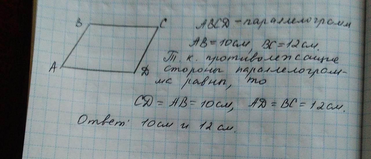 Две стороны параллелограмма равны 10 см и 12 см.Чему равны две другие его стороны? Объясните ответ .
