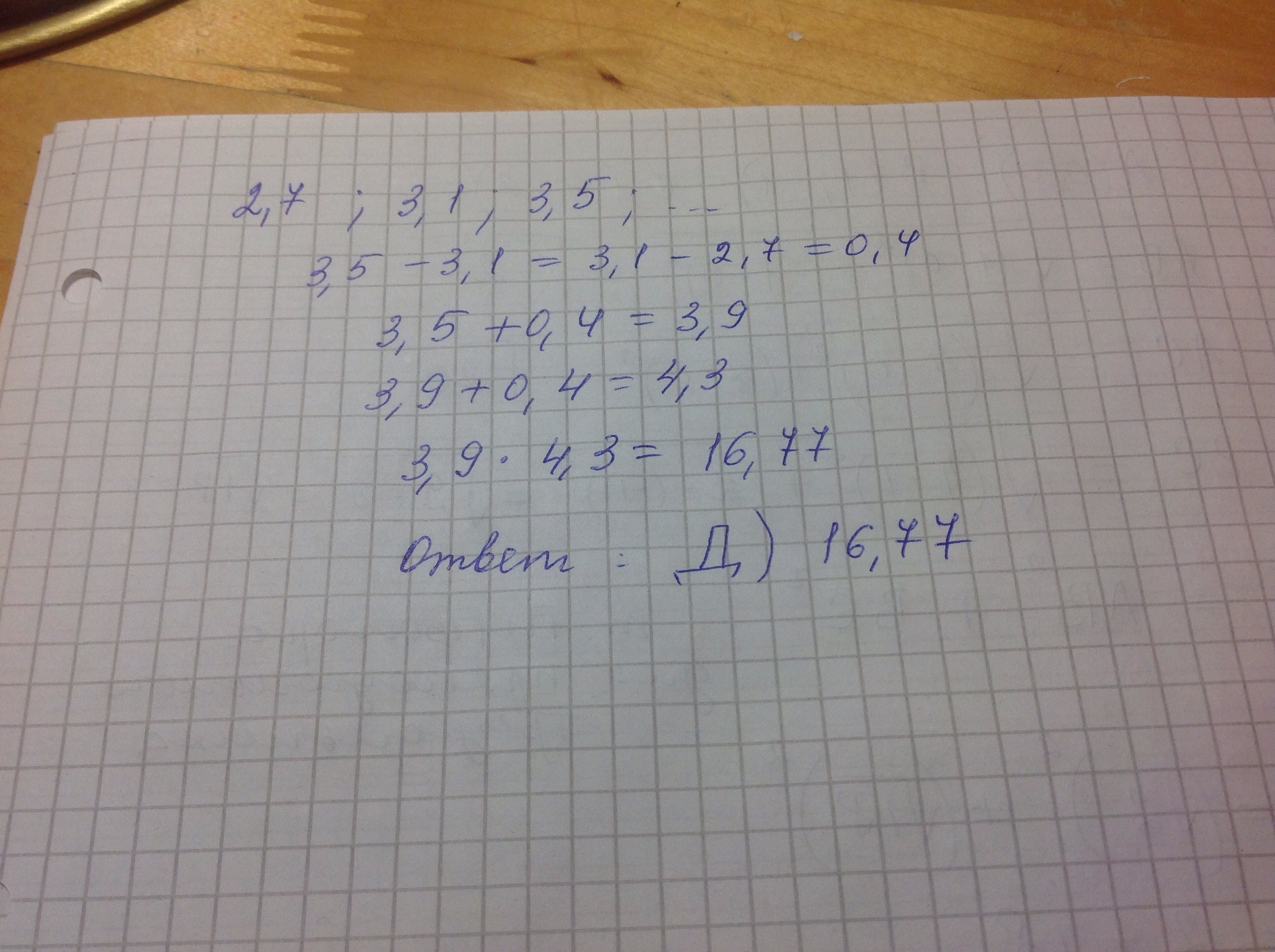 Чему равна произведение двух следующих членов последовательности?2,7;3,1;3,5;...А)13,77;В)14,77;С)15,77;Д)16,77