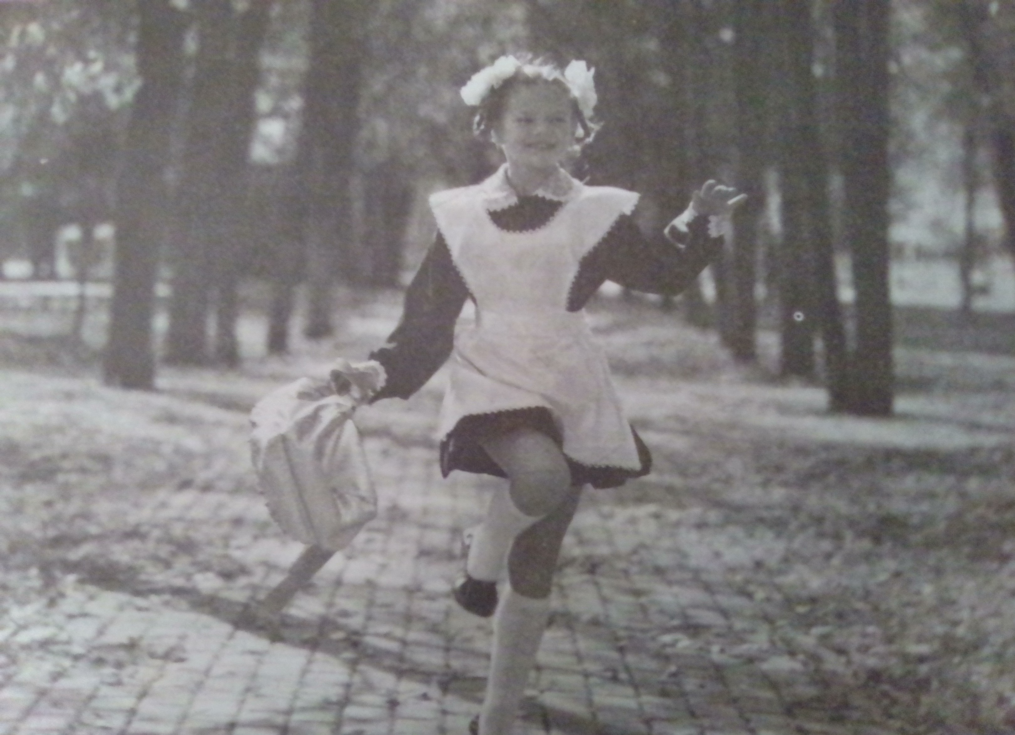 Девочка бежит по аллее, ее руки не выпускают портфель. Кажется, что ученица машет кому-то или бежит навстречу своим школьным друзьям. Фотография очень атмосферная и радостная. У школьницы на лице видно настоящее счастье. Благодаря этой героине фотография вызывает теплые эмоции.