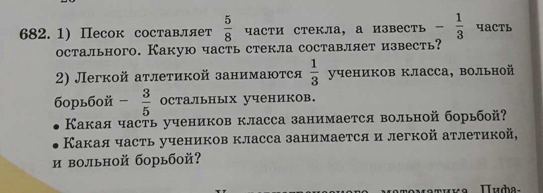 борьбой 35 * 2/3 = 2/5. Лёгкой атлетикой и борьбой занимается 1/3 + 2/5 = 5/15 + 6/15 = 11/15