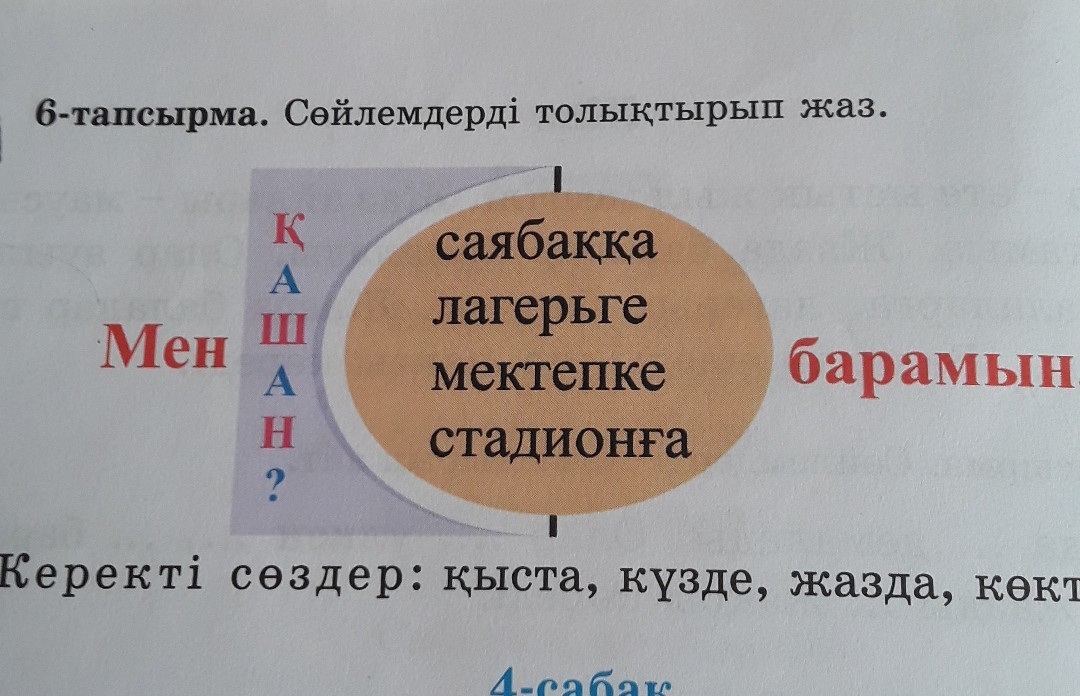 Мен күзде(қашан?) мектепке барамын.Мен жазда(қашан?)лагерьге бармын.Мен қыста(қашан?)стадионға барамын.Мен көктемде(қашан?)саябаққа барамын.